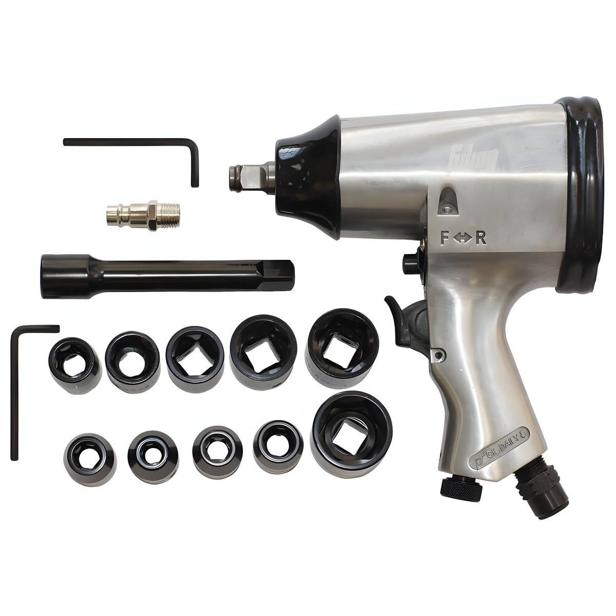 В комплект набора входит: пневмогайковерт, 10 головок 1/2", удлинитель 1/2" на 125 мм, 1 шестигранный ключ 4 мм, 1 штуцер, масленка.