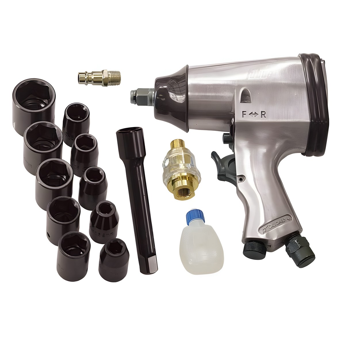 В комплект набора входит: пневмогайковерт 10 головок 1/2" 1 удлинитель 1/2" 125 мм 1 шестигранный ключ 4 мм 1 масленка 1 минилубрикатор 1 штуцер кейс