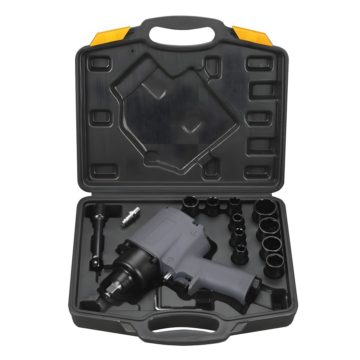 В комплект набора входят: кейс, набор головкок: 9, 10, 11, 13, 14, 17, 19, 22, 24, 27 мм, удлинитель 1/2" 125мм
