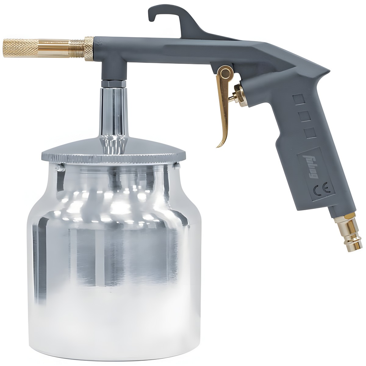 Пневмопистолет пескоструйный с бачком. Используется для шлифовки деревянных, металлических, каменных поверхностей и подготовке их к нанесению лакокра сочных материалов. Продув совершается выходящим под давлением воздухом с абразивным веществом, которое подается через специальный шланг из бачка.
