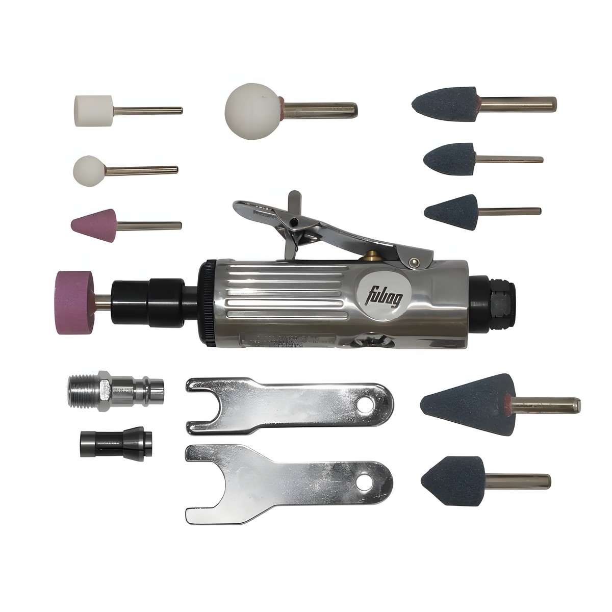 В комплект набора входит: пневмошлифмашина, 2 гаечных ключа, 5 камней 3 мм, 5 камней 6 мм, 1 цанга 3 мм, 1 штуцер, 1 цанга 6 мм